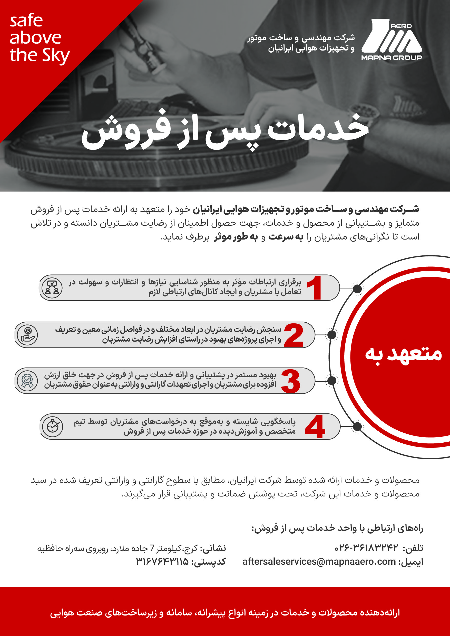 شرکت مهندسی و ساخت موتور و تجهیزات هوایی ایرانیان، خود را متعهد به ارائه خدمات پس از فروش متمایز و پشتیبانی از محصول و خدمات، جهت حصول اطمینان از رضایت مشتریان دانسته و در تلاش است تا نگرانیهای مشتریان را به سرعت و به طور مؤثر برطرف نماید.